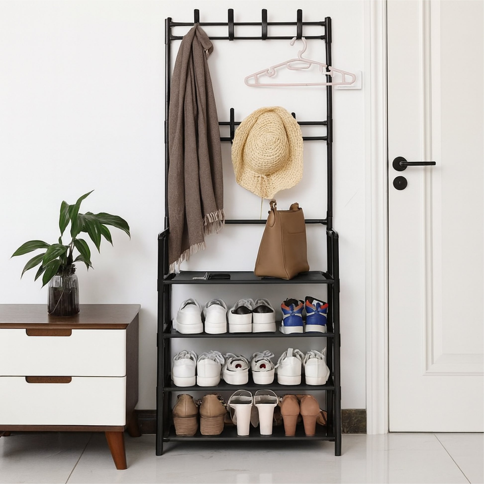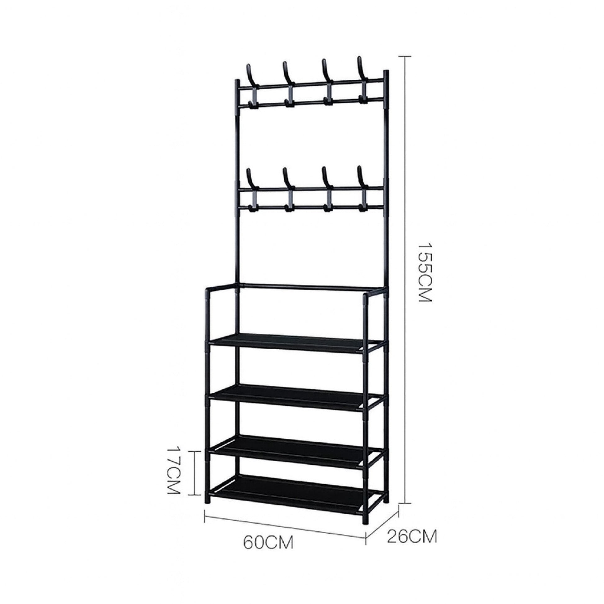 - 2-in-1 Storage Solution – Combines a shoe rack and clothes hanger, perfect for organizing footwear, coats, scarves, bags, and accessories.